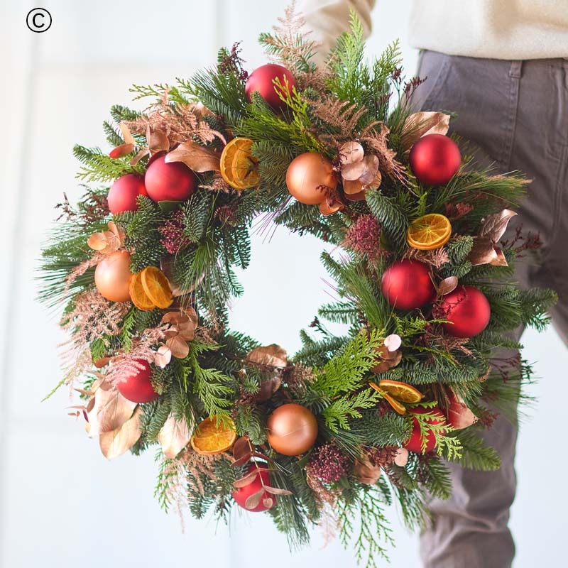 A classic Christmas wreath in iconic festive colours, including festive favourites. Rich reds, burgundies and greens. Pops of cream and peach. You might see pine cones, scented dried fruit, spruce and pine.
