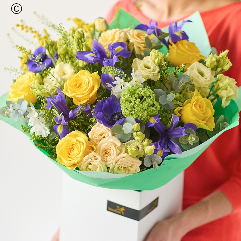 A gorgeous bouquet of fresh blooms including at least five yellow roses and four purple iris, expertly arranged into a stunning bouquet. A perfect gift for rose lovers, iris lovers, January and February birthdays.